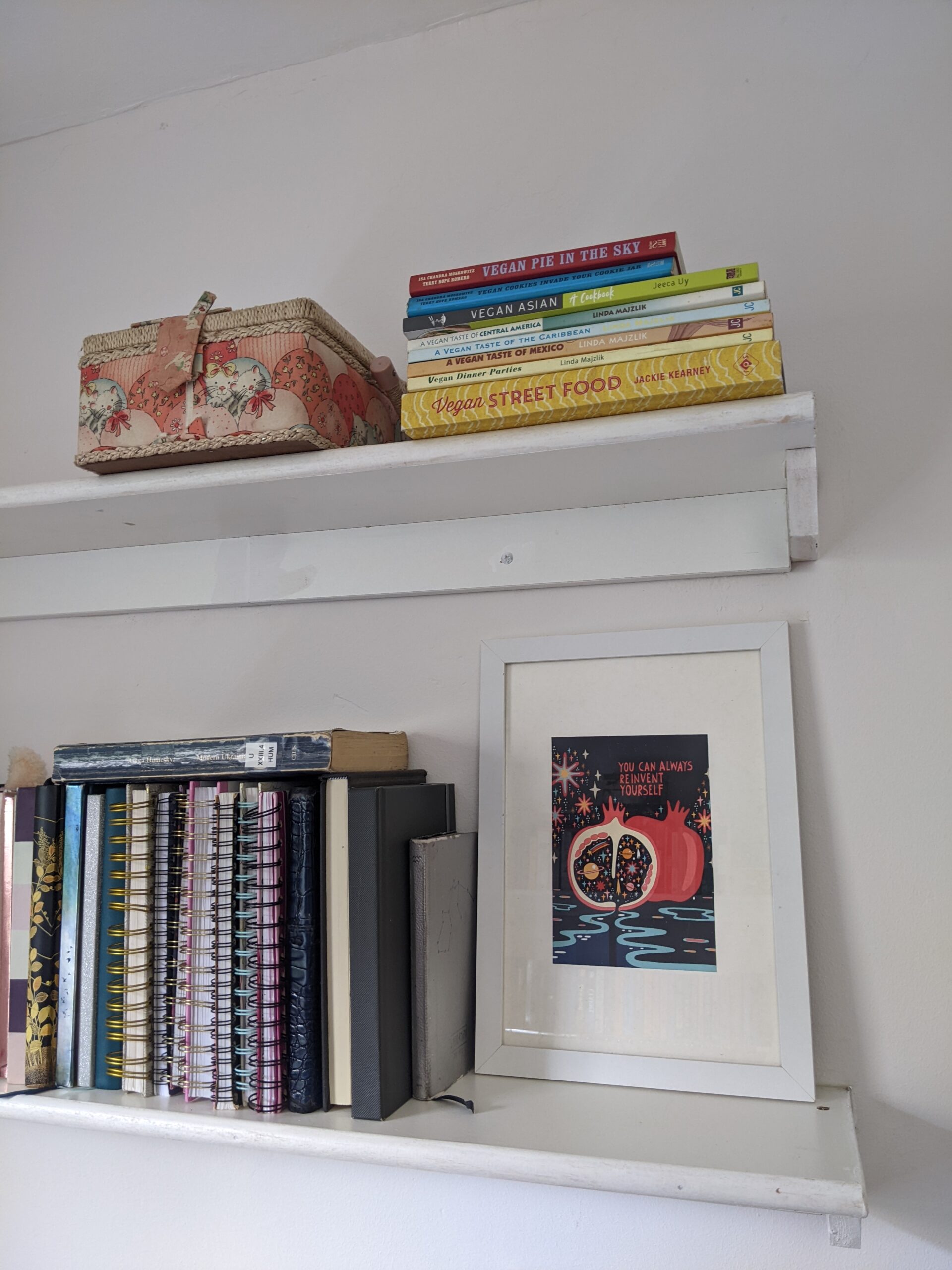 At the end of the bookshelf in my bedroom sits a painting by the Croatian artist Asja Boroš. A pomegranate split open to reveal the entire universe, captioned with the words “You can always reinvent yourself”. Fitting, I suppose, that the shelf leading up to it is filled with all my years of diaries. The painting used to hang above the sink in my kitchen. I remember looking up at it in March as I took a leap of faith, chose to be selfish, chose to be brave.