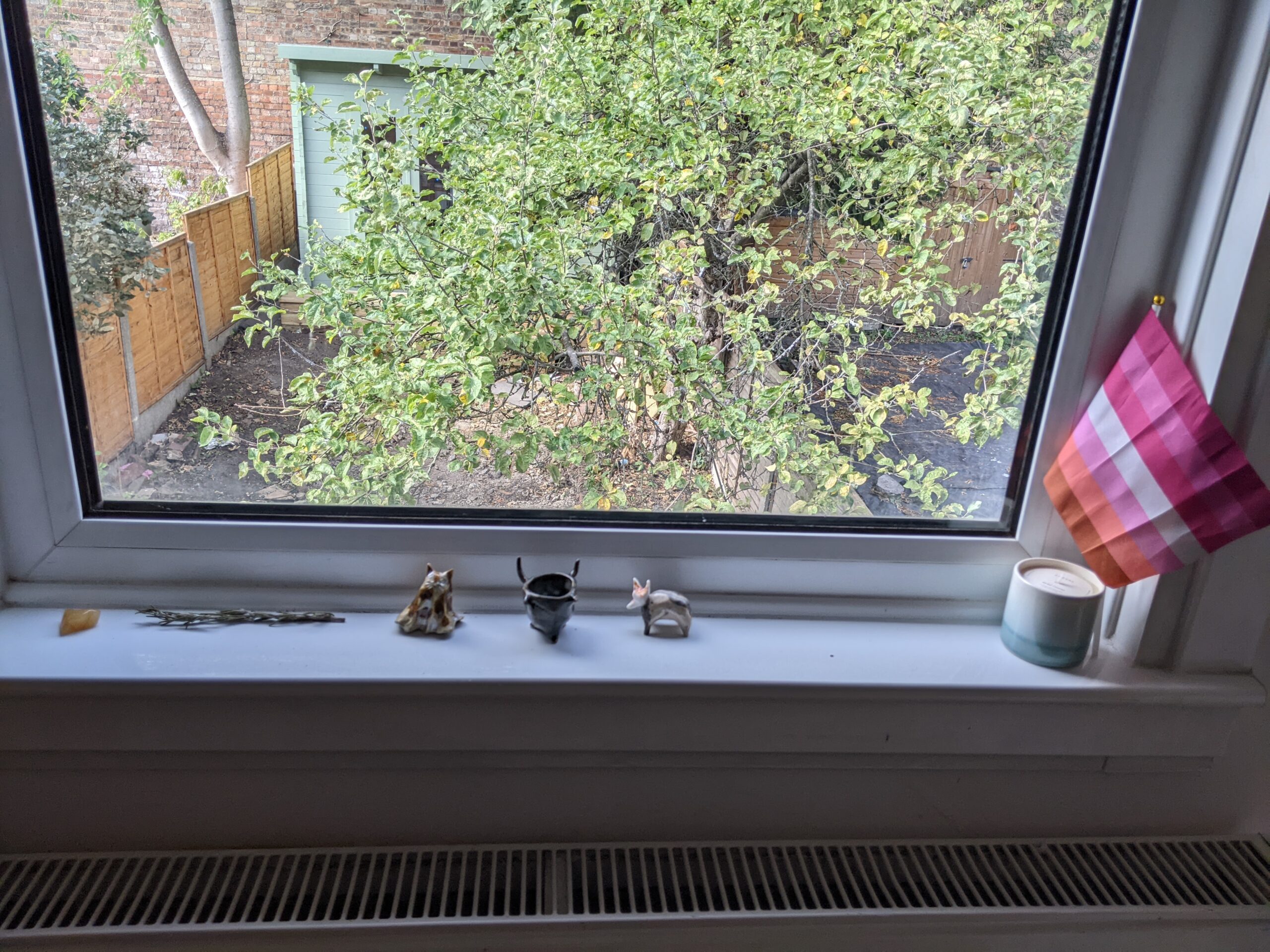 The real evidence sits on my windowsill. A Citrine crystal and a sprig of rosemary from my yoga teacher. Three pottery figurines, made precious to me not just for their craftsmanship and beauty, but for the hands that made them. And a lesbian flag, leaning nonchalantly behind a candle in the corner. Indisputable evidence that I am not the girl I was in Glasgow. The crystal, the rosemary, the pottery cat and cauldron and indecipherable animal have all belonged to me since Sunday. The day I got the call from the landlady, telling me I could move in. I got the lesbian flag in April, from the LGBTQ centre in Blackfriars. I used to keep it tucked away in the back of a cupboard, now it’s the first thing I see when I enter my bedroom.